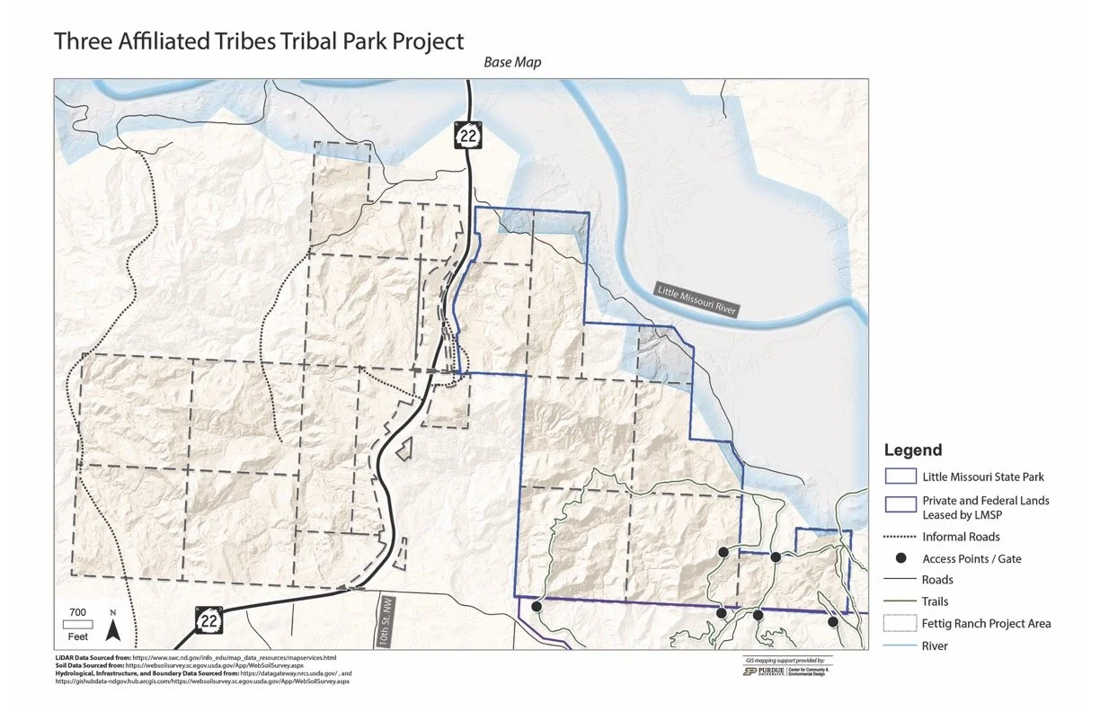 Land located on the east side of Hwy 22 can be accessed from the north via existing dirt road on property managed by the Army Corps of Engineers. From the South side, land access involves entering on foot from Little Missouri State Park either by parking on 103rd Avenue NW near the Little Missouri State Park Entrance Monument Sign or by parking at an established park near a trailhead, and hiking on state park trails until crossing onto MHA land.