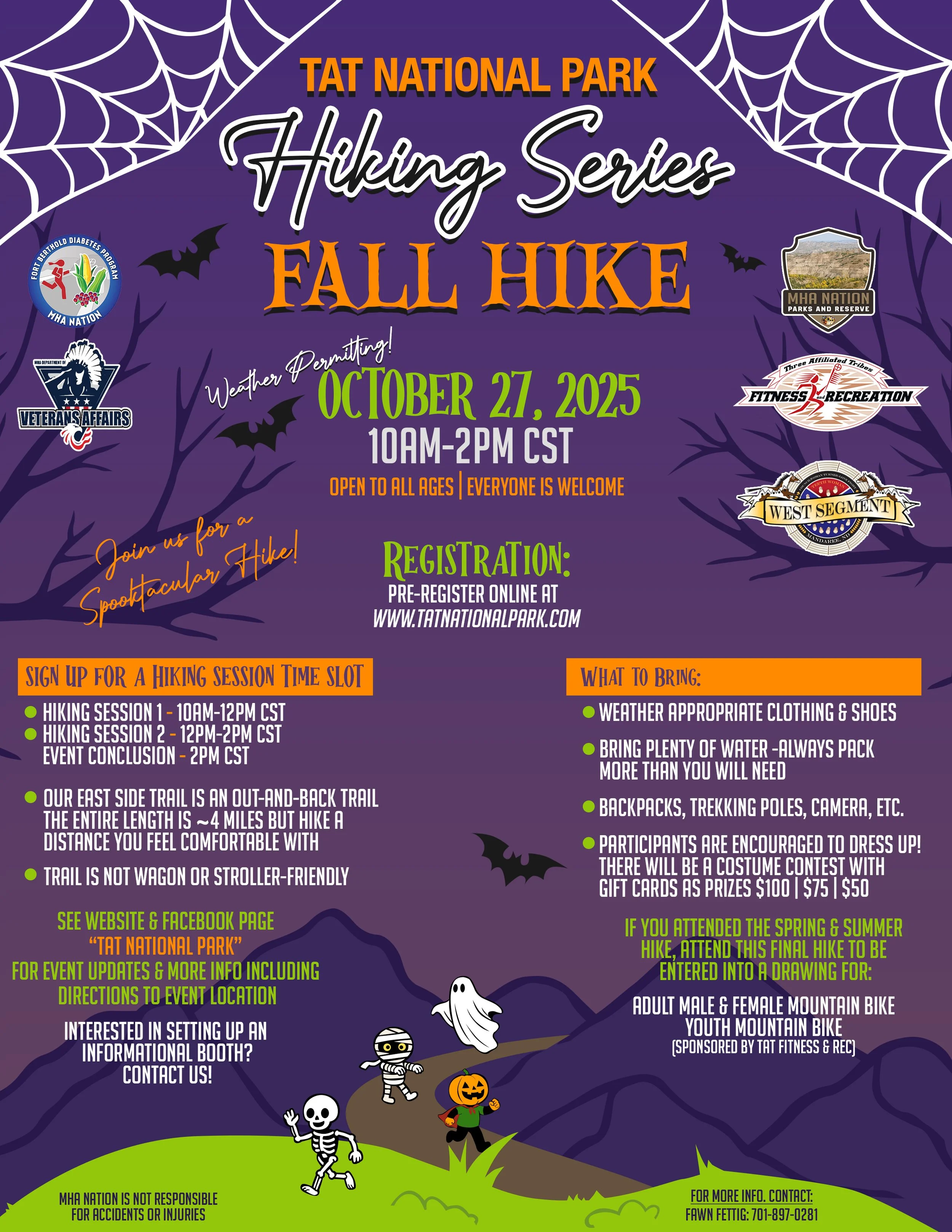 Hike a distance you feel comfortable with. The participants who attend all 3 hikes will be entered into a drawing for a mountain bikes sponsored by TAT Fitness & Rec.